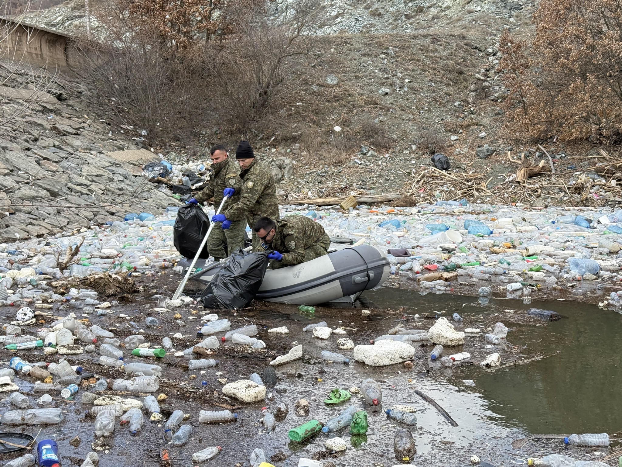 5Pjesëtarë të FSK-së duke mbledhur bërllogun përskaj liqenit të Badovcit
